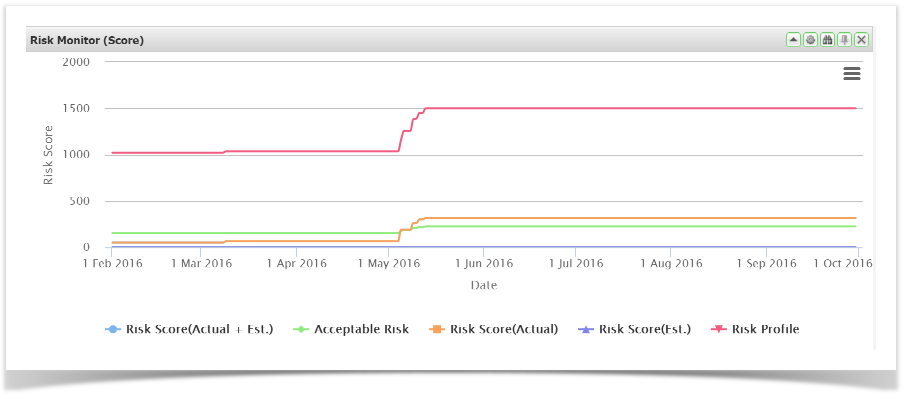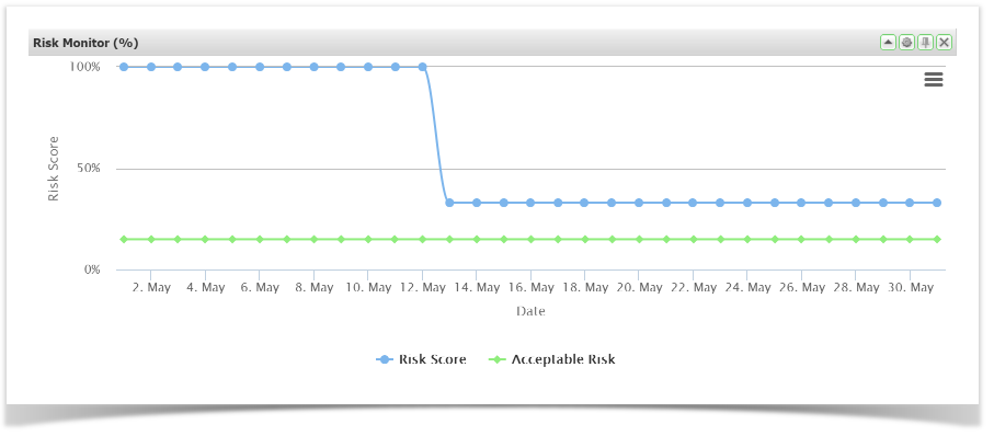 The Risk Monitor gadget displays the actual level of Risk (blue line) versus the acceptable level of Risk expressed as a percentage (green line).
