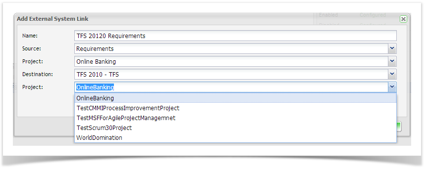 Once the TFS connection has been created (see External Systems), you can begin associating projects in the defect tracker TFS with projects in Enterprise Tester. Project links can be created and managed either from the Resources tab on your tree view navigator or on the External System Links tab.