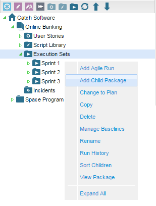 - Right click on the Execution Sets or a folder within it and select Add Child Package or select the Add Execution Package icon at the top of the tree view.