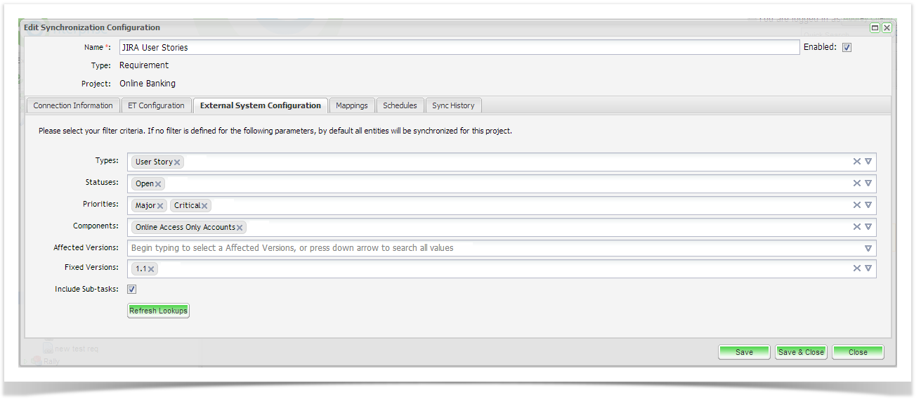 Next, click on the External System Configuration. Select the entity type(s) (requirement, stories etc.) to synchronize with Enterprise Tester. Here you can also select additional criteria including Statuses, Priorities, Components, Affected and Fixed Versions. You can also select to synchronize sub-tasks related to the entities that meet your selection criteria. Note that the filter values only apply to the parent requirement/ user story. All sub-tasks associate to these entities will also be synchronized when you select this option.