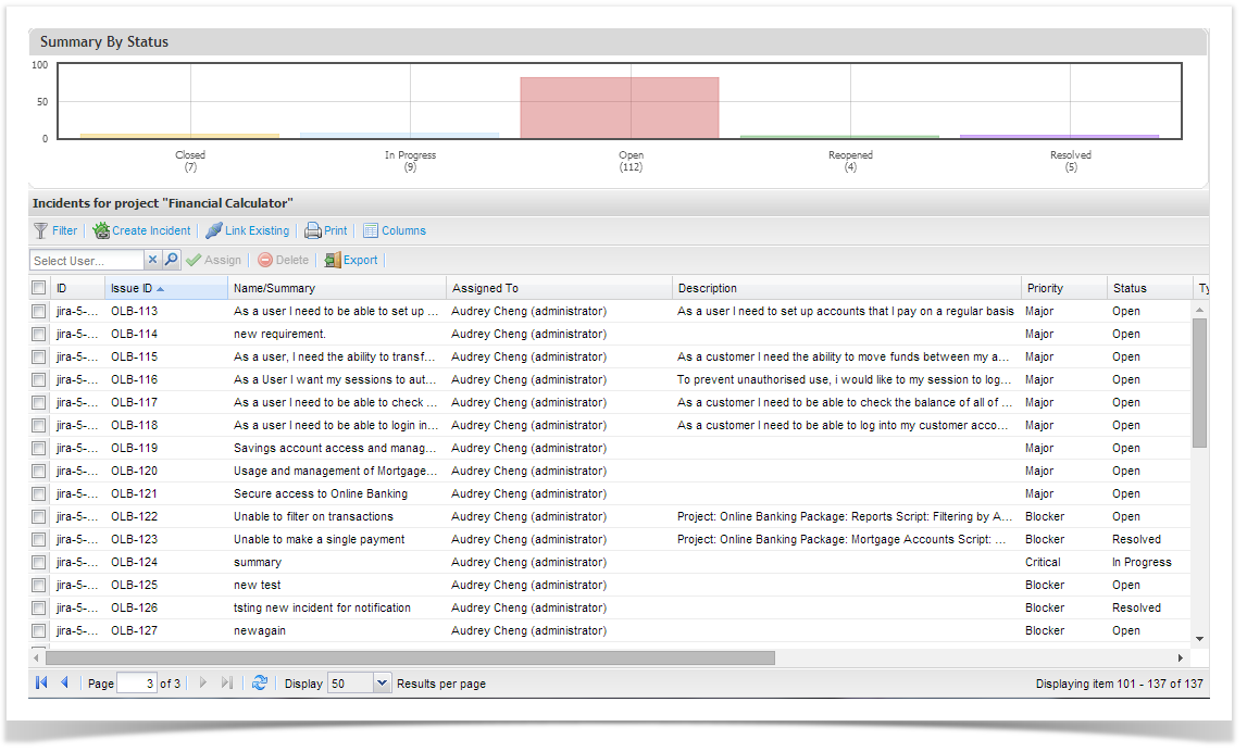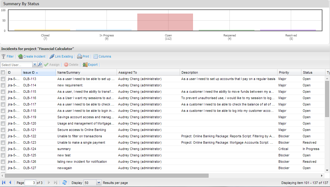 You can update an incident by double clicking it from the list in this screen and editing relevant information. If you are connected to an external defect tracker, a link to the defect tracker incident ID is listed on the incident window as “External Ticket ID”.