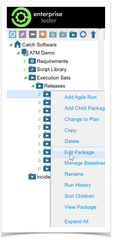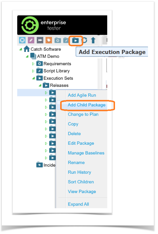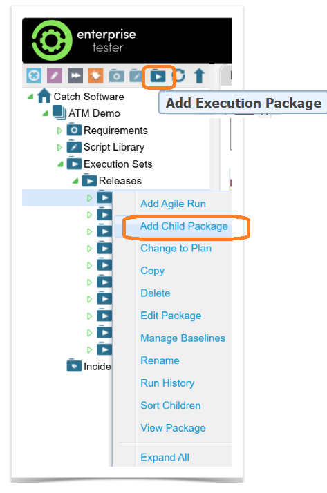 - Right click on the Execution Sets or a folder within it and select Add Child Package or select the Add Execution Package icon at the top of the tree view.