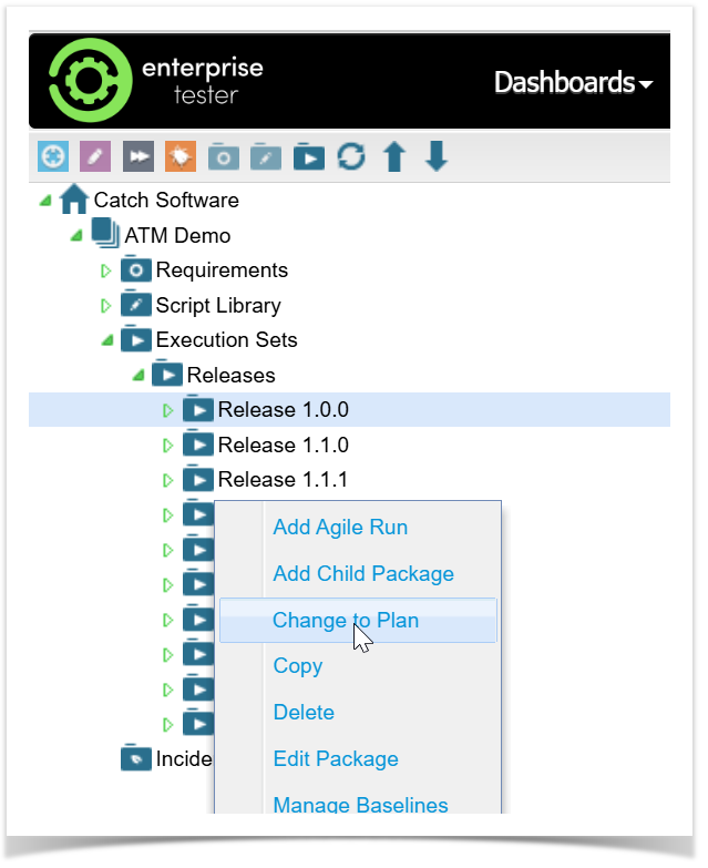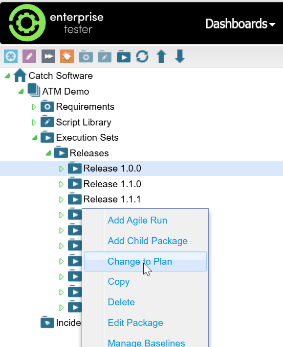 - Right click the Test Execution folder and select Change to Plan (or Change to Package as is relevant).