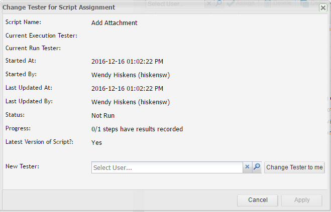 The Change Tester dialog box will provide information about the script and allow a new tester to be set to continue running the script.