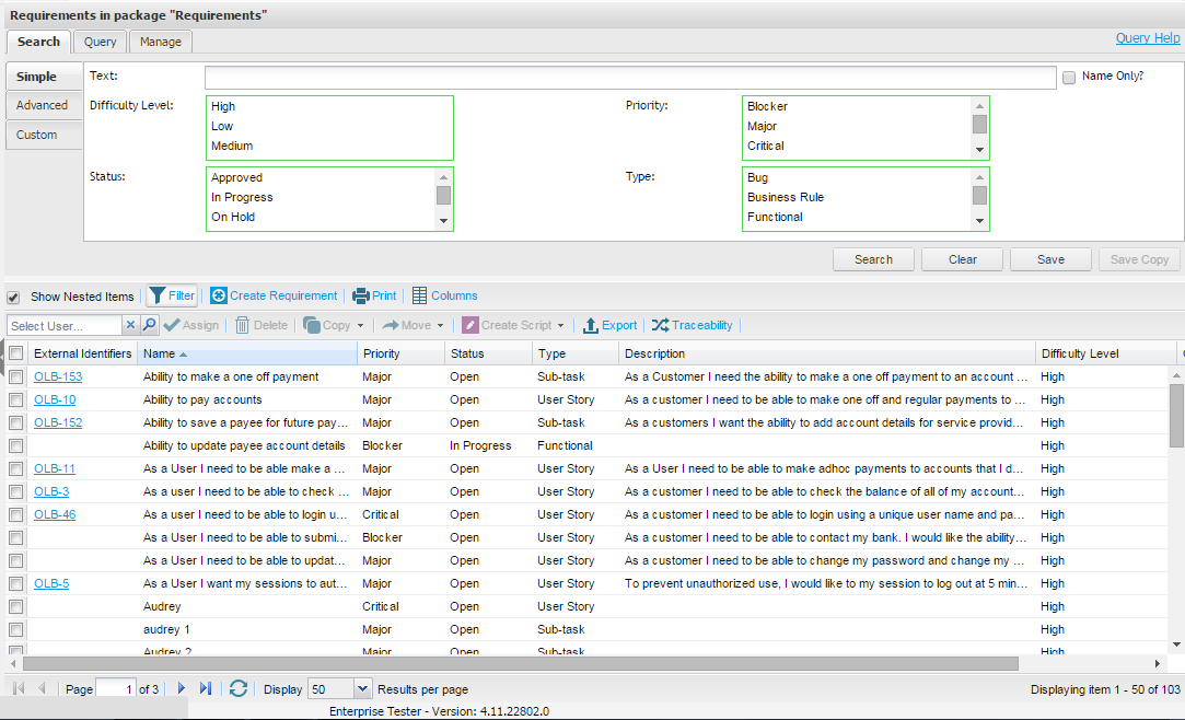 Where a large number of requirements have been created within a single package, it may be helpful to filter these records into more manageable groups. To do this: