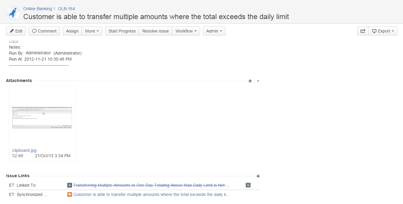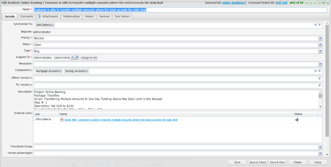 You can update an Incident by double clicking it from the list in this screen and editing relevant information. If you are connected to an external defect tracker, a link to the defect tracker incident ID is listed on the incident window as External Ticket ID.
