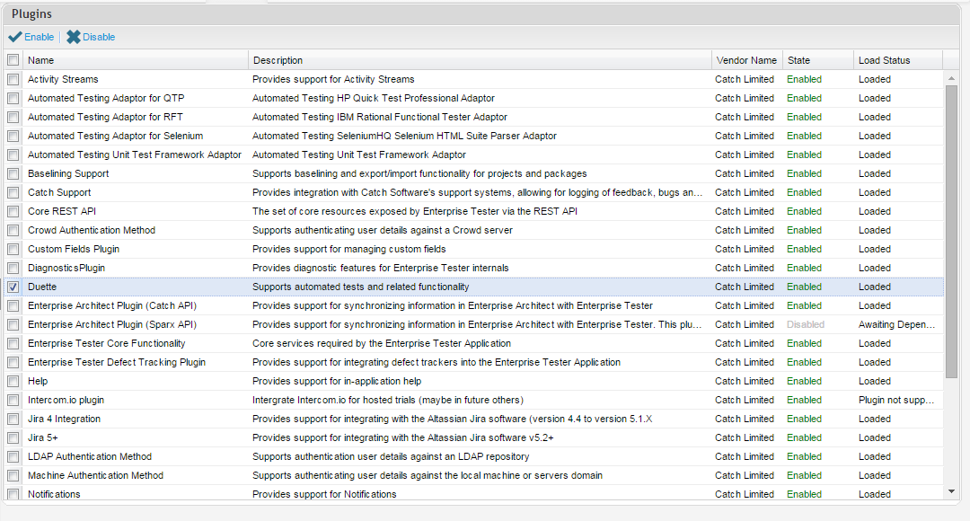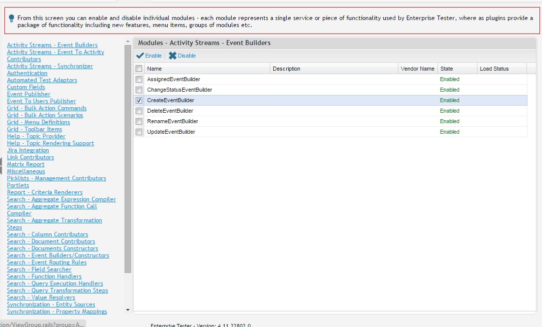 The modules section allows system administrators to enable and disable individual modules — each module represents a single service or piece of functionality used by Enterprise Tester, whereas plugins provide a package of functionality including new features, menu items, groups of modules etc.
