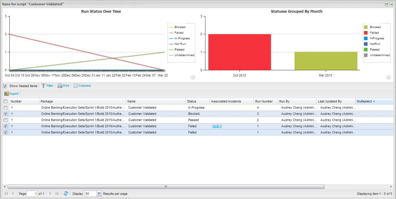 Two charting widgets are provided as standard, the Status Over Time widget and the Statuses Group By Widget. The type of widgets to display are not configurable. From the Run History screen for script assignment. The Status Grouped By widget is configurable and you change chose a date or field parameter to group.
