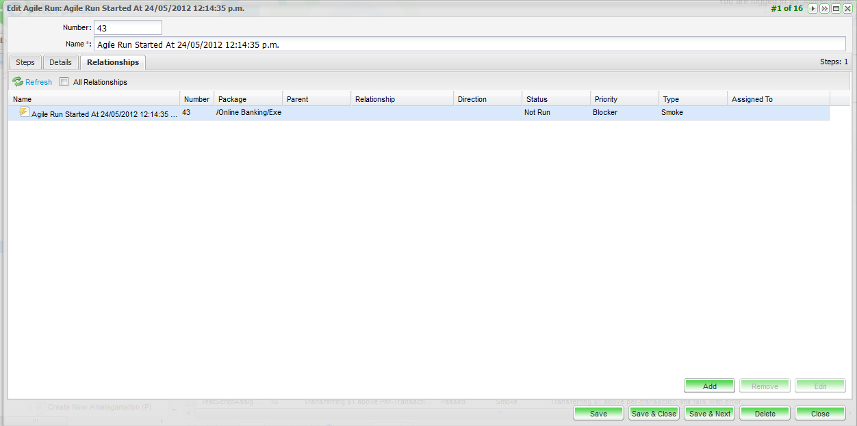 Also notice that Agile Runs also have a ‘Relationships’ tab. Initially no relationships will exist as it is not created from a master script in the Script Library. If an incident is raised during the agile run or if the Agile Run is later converted to a Script in the Script library, relationships will automatically be added.
