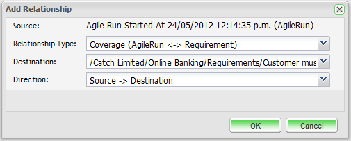 - Destination is the target requirement that this Agile Run will cover. Select the requirement from the pop up selector.