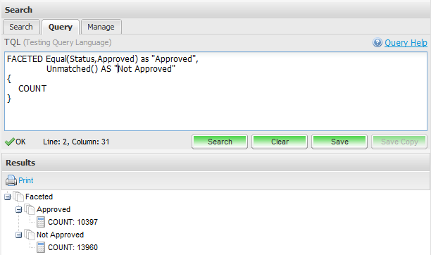 In the above query we are creating two "Facets" - the first facet for all matches where the Status is "Approved", and the second which matches any status which is "Draft" or "Out Of Date", and for each we calculate the count.