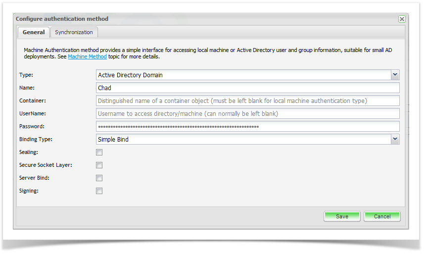| Container | Use this only for Active Directory Domain or Active Directory LDS Store. This is the distinguished name of a container object for users/groups, this should be left blank for Local Machine users. | cn=users,dc=mycompany,dc=com |