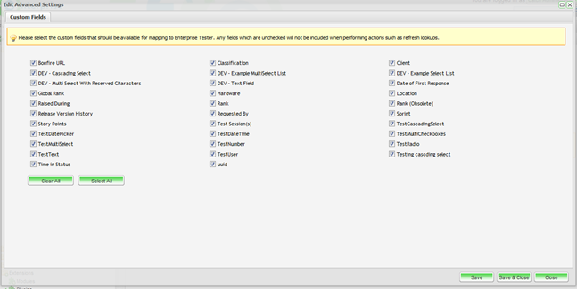 Advance settings allow you to configure which custom fields from your external system will be synchronized with ET. By default, all the custom fields in the defect tracker will be selected for synchronization.