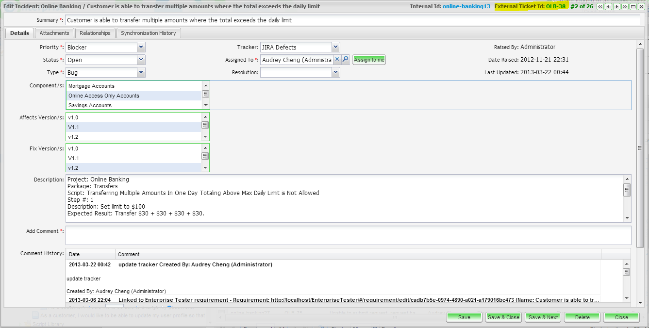 The ability to interface with multiple External Systems (Defect Trackers, ALMs, EA etc.) is another key feature of the tool. This interface allows incidents and or requirements (depending on the tool you are integrating with) to be synchronized between Enterprise Tester and the External System. For requirements, full bi-directional synchronization is supported regardless of the system the entity (requirement/ user story/ ncident/defect) was originally created in. For incidents/defects, only entities created in Enterprise Tester will synchronize with the external system. After the incident is created in the external system, updates made in either Enterprise Tester or the external system will synchronize.