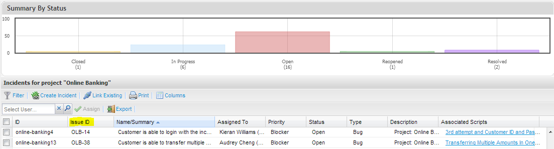 Enterprise Tester adds a reference to the external system ID on the entity. This is visible as a hyperlink on the entity or in the Issue ID column of the entity summary screen grid.
