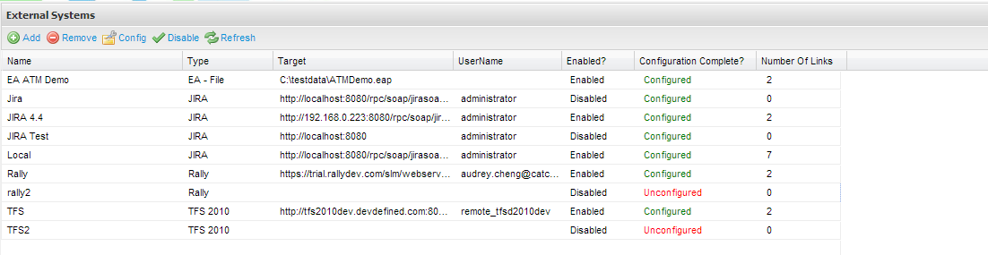 - From the External System summary screen, you can view all existing connections and view their enabled and configuration status. Click on add from the tool bar and add a Name for your external system connection and select a connection type: Enterprise Architect, JIRA ( 4 - 5.1), JIRA, Rally or TFS