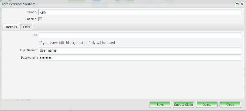 | URL | Enter the URL path for the external system. This can be left blank is you are working with a non-trial hosted instance of Rally. If you are using a trial hosted version of Rally. The URL is: https://trial.rallydev.com/slm/webservice/1.42/ |