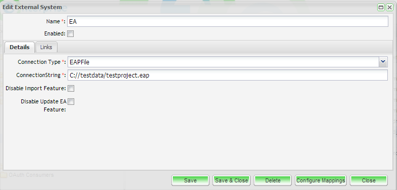 Enterprise Tester will test the external system and will save all details if the connection is validated.
