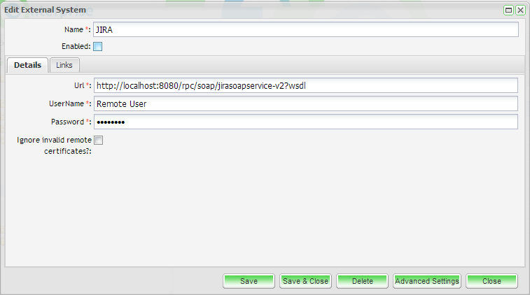 | URL | Enter the URL path for the external system. The URL should take the following forms: JIRA: http://URL/rpc/soap/jirasoapservice-v2?wsdl e.g. http://localhost:8080/rpc/soap/jirasoapservice-v2?wsdl TFS: http://<ServerURL>/<Project Collection> e.g.http://tfs2010server.com:8080/tfs/ProjectET |