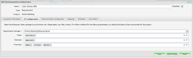 From the Edit Synchronization Configuration screen, click on the ET Configuration tab. Select the ET requirements package you wish to synchronize with. Here you can also select the filter criteria when synchronizing from ET to JIRA. You can filter on Types, Statuses and Priorities. Once you have completed your configuration, click ‘Save’.