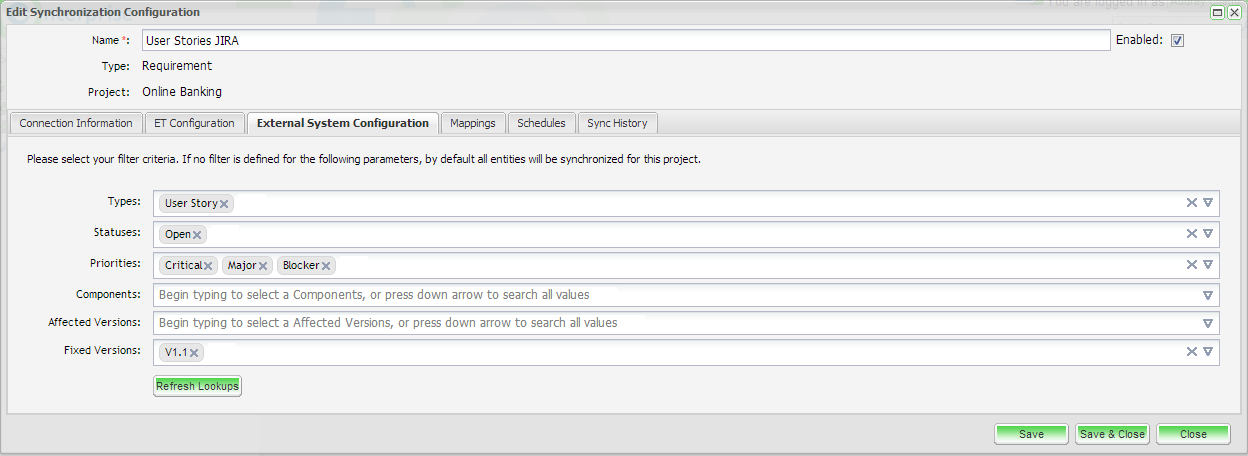 Next, click on the External System Configuration. Select the entity type(s) (requirement, stories, epics etc.) to synchronize with Enterprise Tester and click ‘Save’.