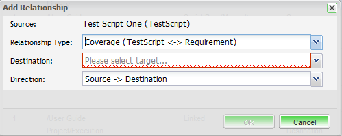You can add relationships via this tab if you require. To add a relationship select the Test Script you wish to associate with another item and click the add button. The add relationship pop up dialogue is displayed.