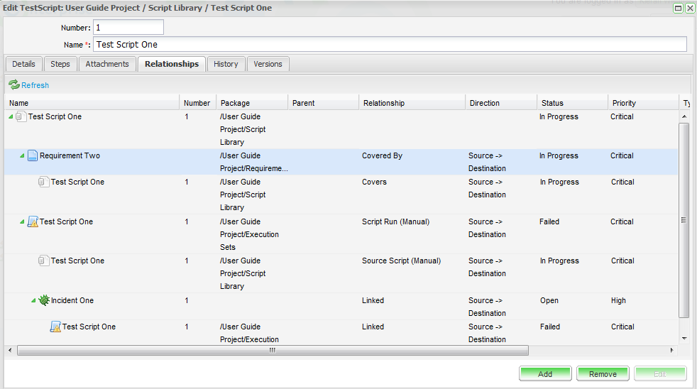 You can view and manage Test Script Relationships from the Relationships tab.
