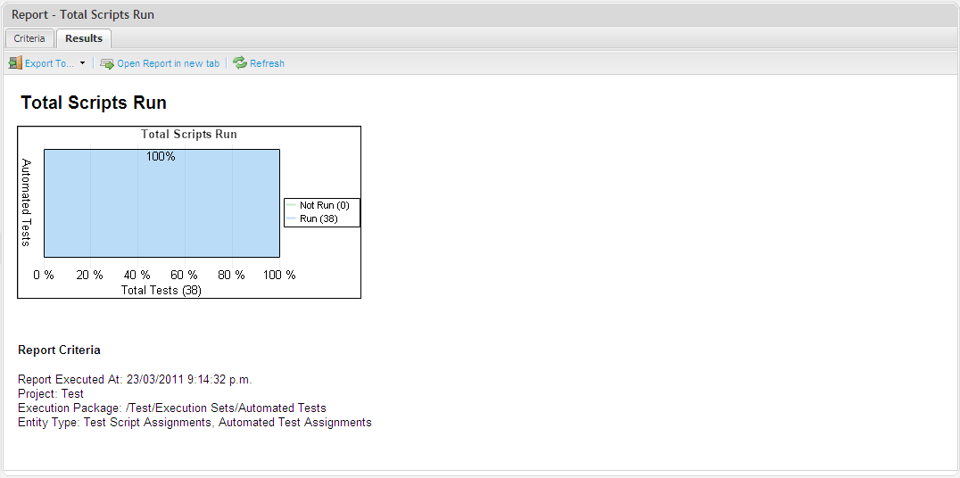 You can define the package to report on and the test type(s) you would like to view the Run status of. You can select Automated Test Assignments or Manual Test Assignments (Test Script Assignments).