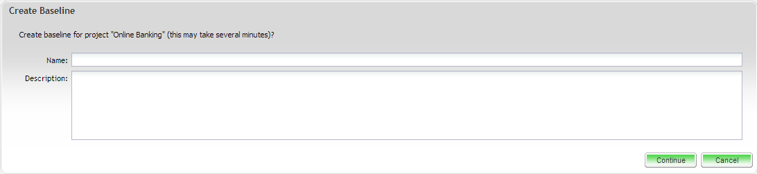 2. The Create Baseline screen will open. Add the Name and Description details in the appropriate fields provided and click Continue.