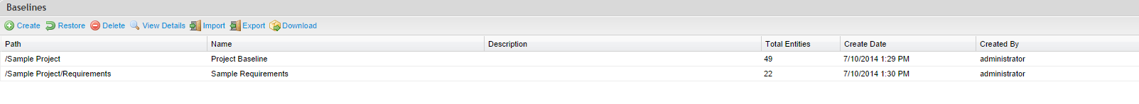 Baselines for capturing a snapshot of your project or package at a point it time. You can capture them as a historical record or use them to restore a template structure of a base set of requirements and scripts.