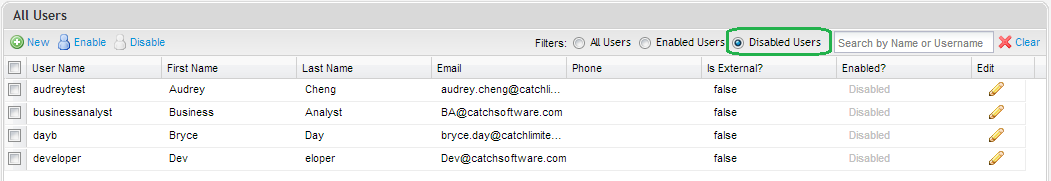 You can also easily view only Enabled User or only Disabled Users by selecting one of the pre-configured filters on the toolbar.