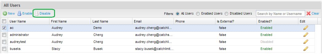 To disable one or many users, you can simply select a the users from the grid by checking the row containing the user details and clicking Disable from the toolbar.
