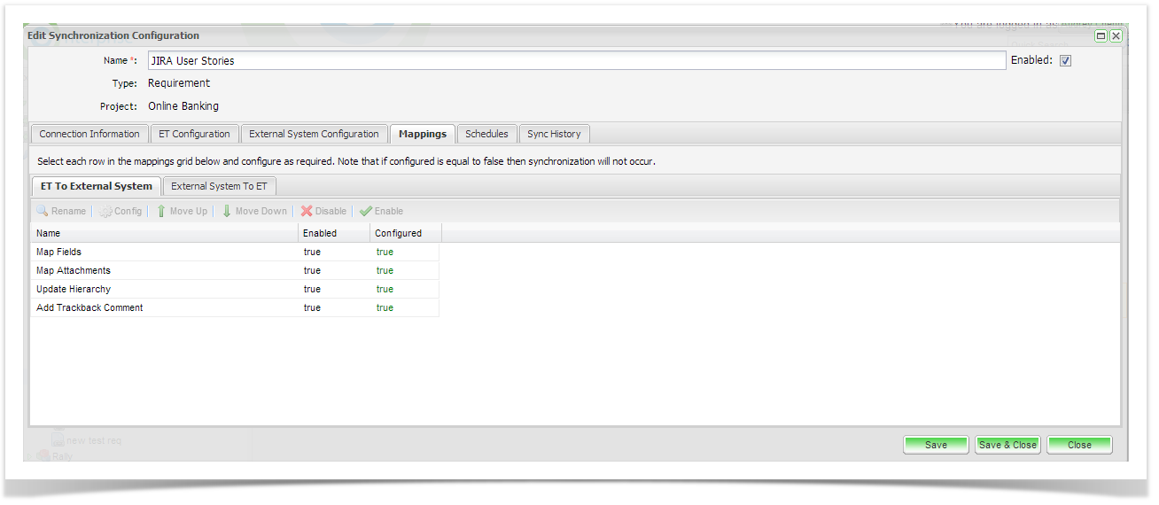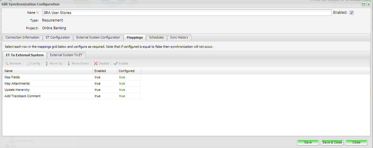 Allows a set of mappings to be configured to transfer information between Enterprise Tester and the External System (JIRA)