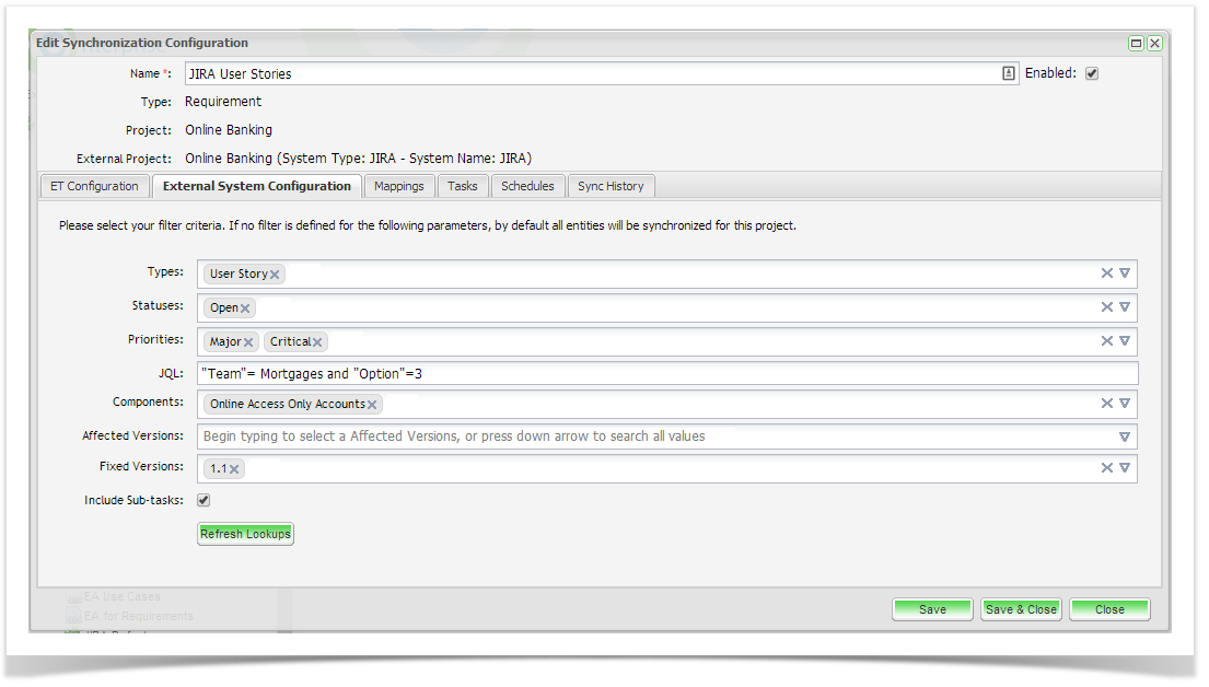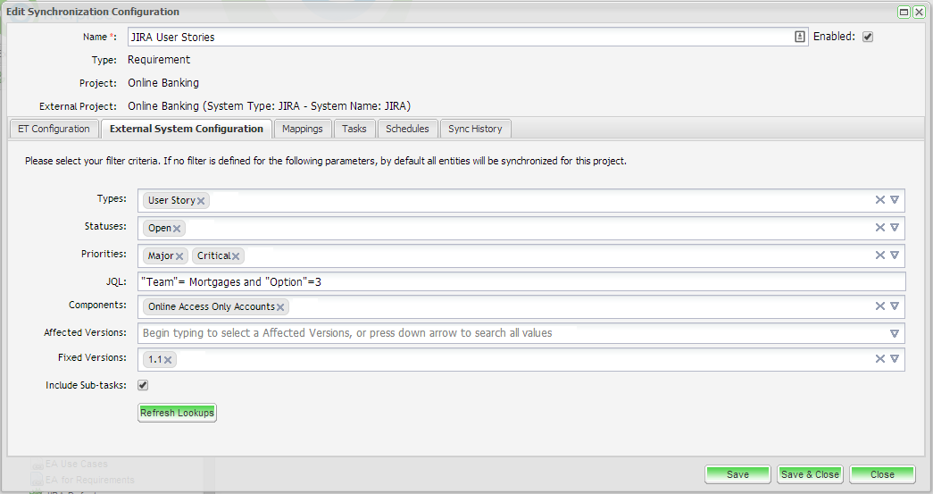 Next, click on the External System Configuration. Select the entity type(s) (requirement, stories etc.) to synchronize with Enterprise Tester. Here you can also select additional criteria including Statuses, Priorities, Components, JQL fragments, Affected and Fixed Versions.  You can also select to synchronize sub-tasks related to the entities that meet your selection criteria.  Note that the filter values only apply to the parent requirement/ user story.  All sub-tasks associate to these entities will also be synchronized when you select this option.
