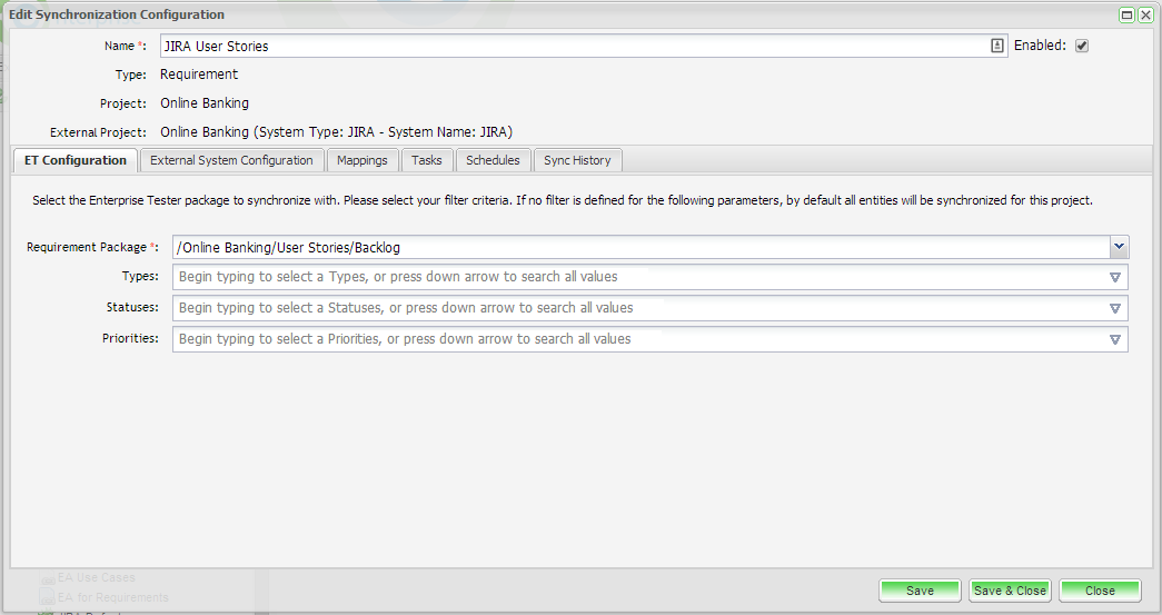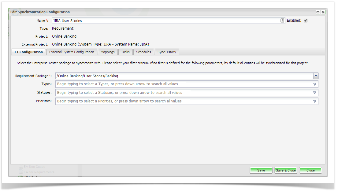 From the Edit Synchronization Configuration screen, click on the ET Configuration tab. Select the ET requirements package you wish to synchronize with. Here you can also select the filter criteria when synchronizing from ET to JIRA. You can filter on Types, Statuses and Priorities. Once you have completed your configuration, click ‘Save’.