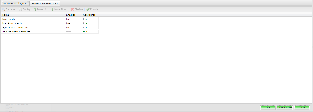 The next step is to configure TFS to Enterprise Tester field mappings. On the External System to ET tab, there are also four activities that are set to run on Synchronization of an incident: