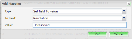 | Set Field to Value | Set field to value field mapping allows you to specify a value to populate the field in ET with regardless of the values in TFS. All Field types are supported. |