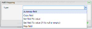 | Set Field to Value (if it's null or empty) | Set field value field mapping allows you to specify a value to populate the field in ET with, if the field does not currently have a value set/is null. All Field Types are supported. This mapping type is useful for setting a default value, if the value was not populated by a previous mapping (and so when used in this way, the mapping should appear at the bottom of the list of field mappings). |