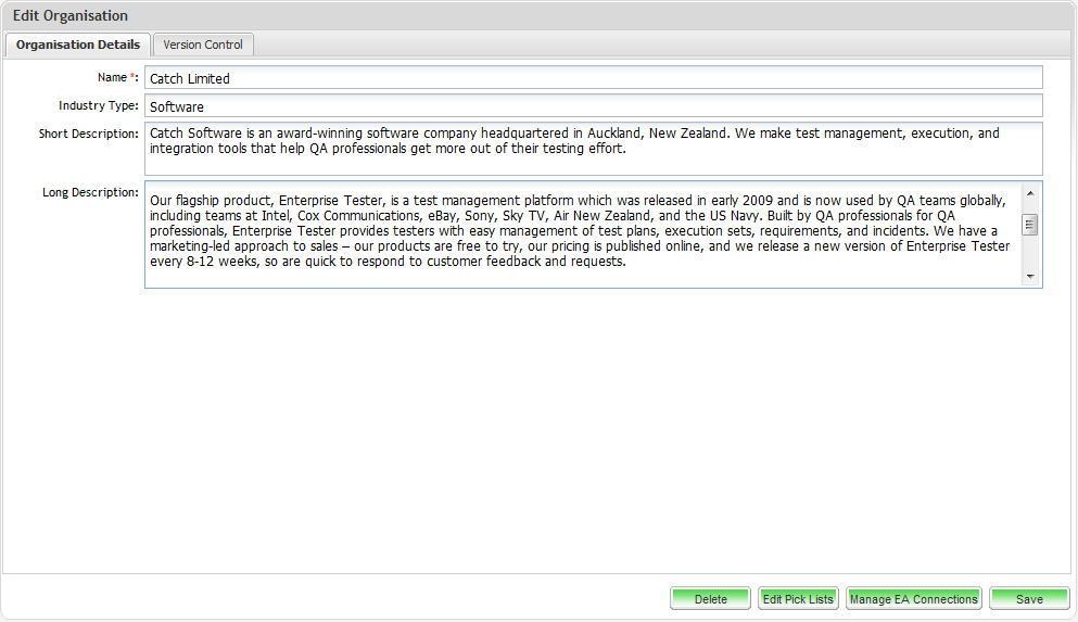 From the organization set up screen, in addition to providing the organization details, you can set up the external version control, add Enterprise Architect connections and configure your pick lists.