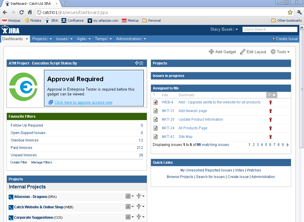 - The gadget should now display on your JIRA dashboard but will not be authorized. Click on the "Click here to approve access now" link.