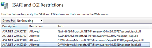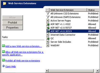 Start up the IIS Manager (Click Start -> Run and type %windir%\system32\inetsrv\iis.msc. click OK ). Expand the server, and highlight "Web Service Extensions".