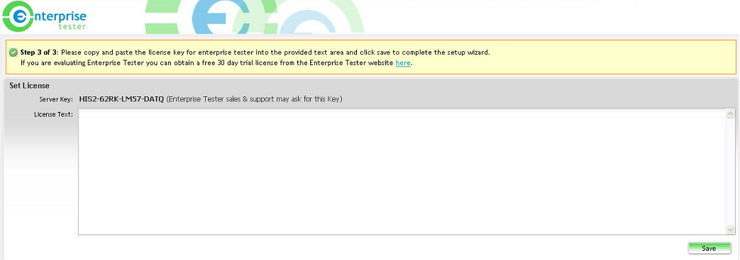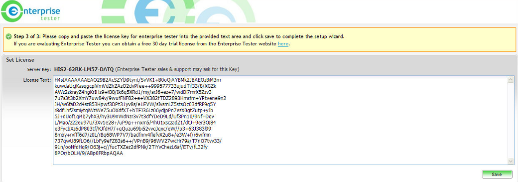 Once the License Text is displayed copy this from the License Generator into the Enterprise Tester License Text field and click on ‘Save’.