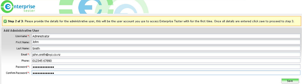 You will now be requested to supply the default Administrative user for the installation. Supply the Name, Email and Password for the administrative user and click on ‘Save’.
