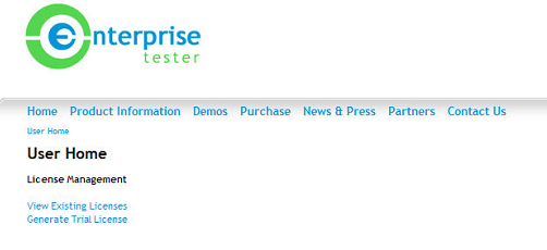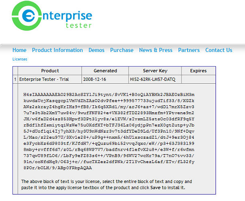 To do this copy the server key as listed on the screen and click on the link to the Enterprise Tester web site. You will then have access to the License Generator.
