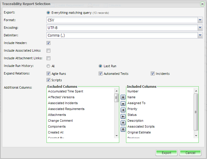 In addition to the basic requirement fields you can also export (optionally) all the related Test Script (Manual and Automated), Script Run (Agile, Manual, Automated) and Incident information In addition, you have the option to include fields specific to these other entities as well e.g. JIRA Issue ID.
