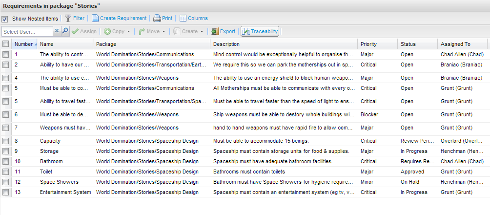 A requirement traceability export format is available from the requirement summary view. This export allows you to view you requirements and any related entities, giving you full traceability.