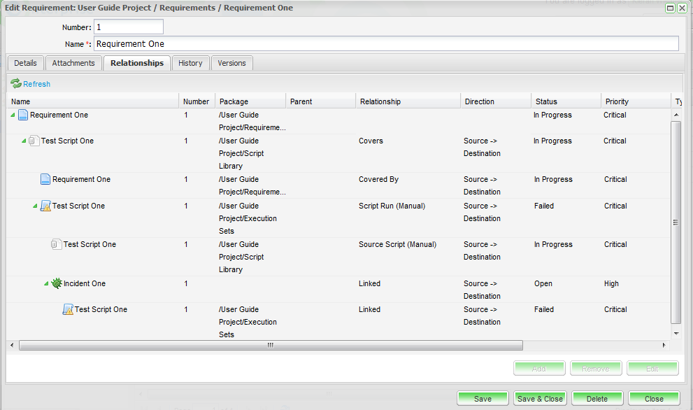 Associated Requirements, Scripts, Script Runs, Automated Source Tests, Automated Test Runs and Incident relationships are displayed. The example below displays the relationships between one linked requirement, test script, test run and incident.