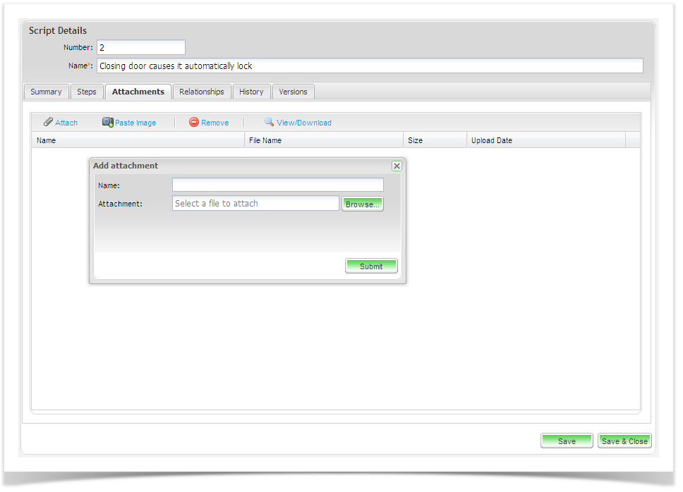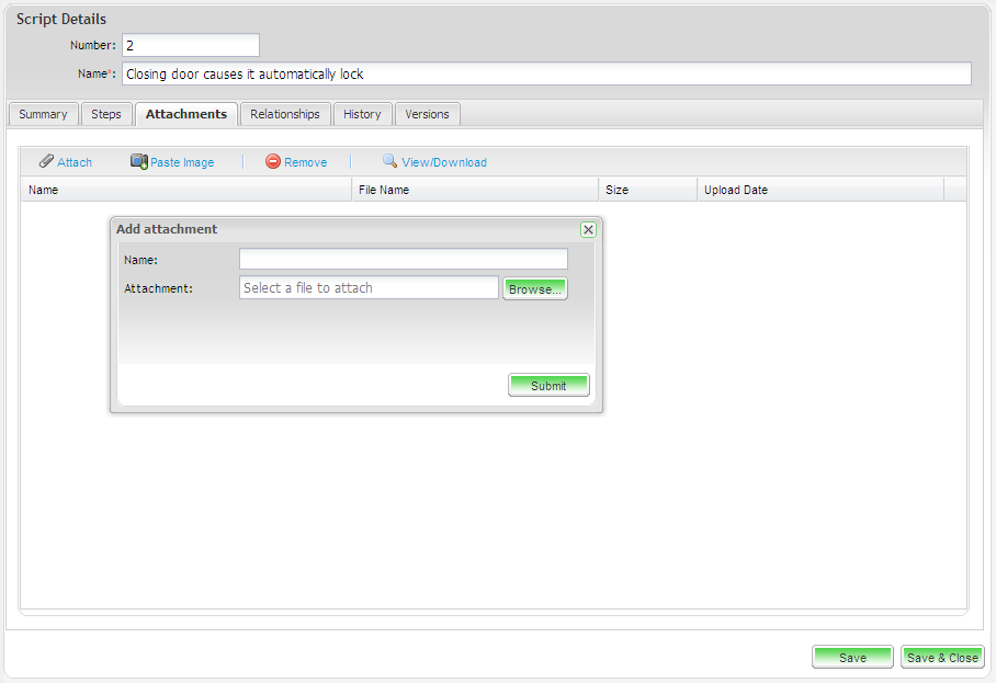 4. Provide a name for the attachment and click on ‘Submit’ - the attachment will now be added to the script.