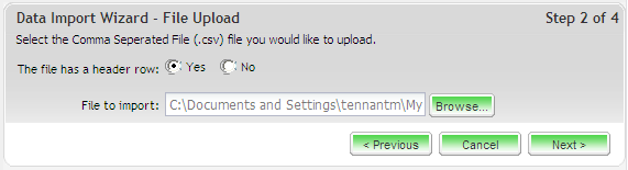 Browse to where your CSV file is stored and specify if the file contains a header row using the radio buttons provided, then click on ‘Next’.