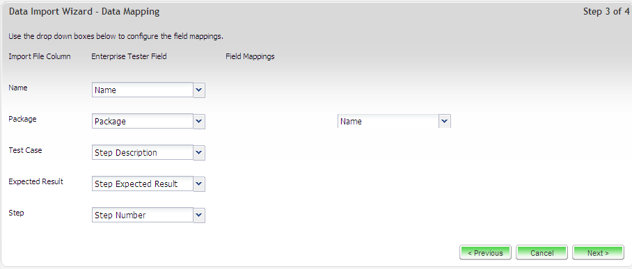 The application will read the CSV file and ask you to map the fields in Enterprise Tester to those in your CSV. Use the drop down boxes to map the fields in your CSV file to the fields in Enterprise Tester. Since V2.3, Importing to Enterprise Tester custom fields is also supported.